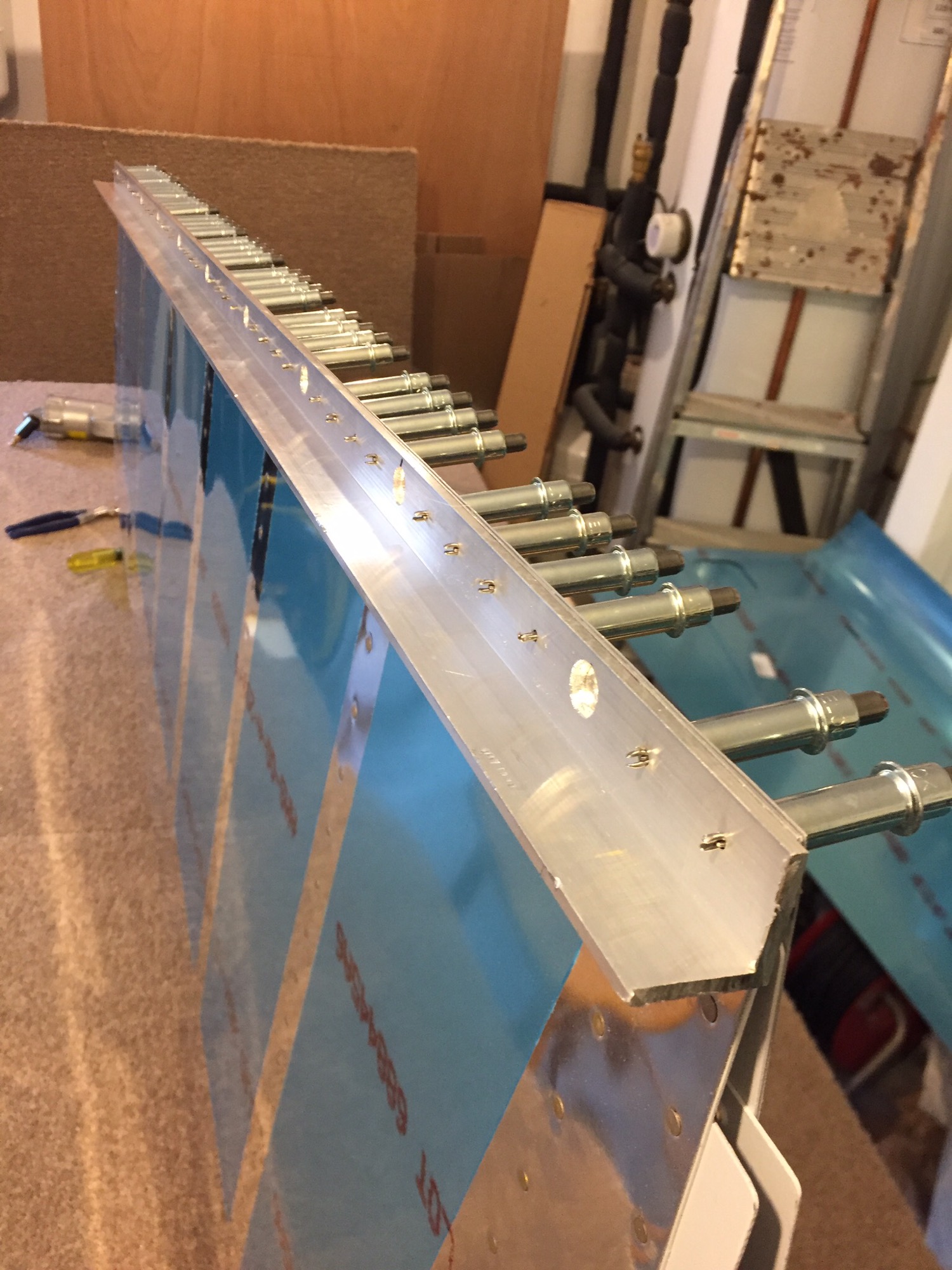Next up, the dreaded trailing edge. I decided to use a technique recommended to me by another builder which involves using a piece of angled aluminium match drilled to the trailing edge. Every 6th home I drilled it out to about 3/8th so that the squeezer would fit through. It’s then a case of setting the rivets until nearly flush and then moving the angle. As you have to alternate the rivet direction it is all quite time consuming. To finish the double flush rivets I squeezed them with a set that had been ground down to an 8 degree angle (thank you Robbie).