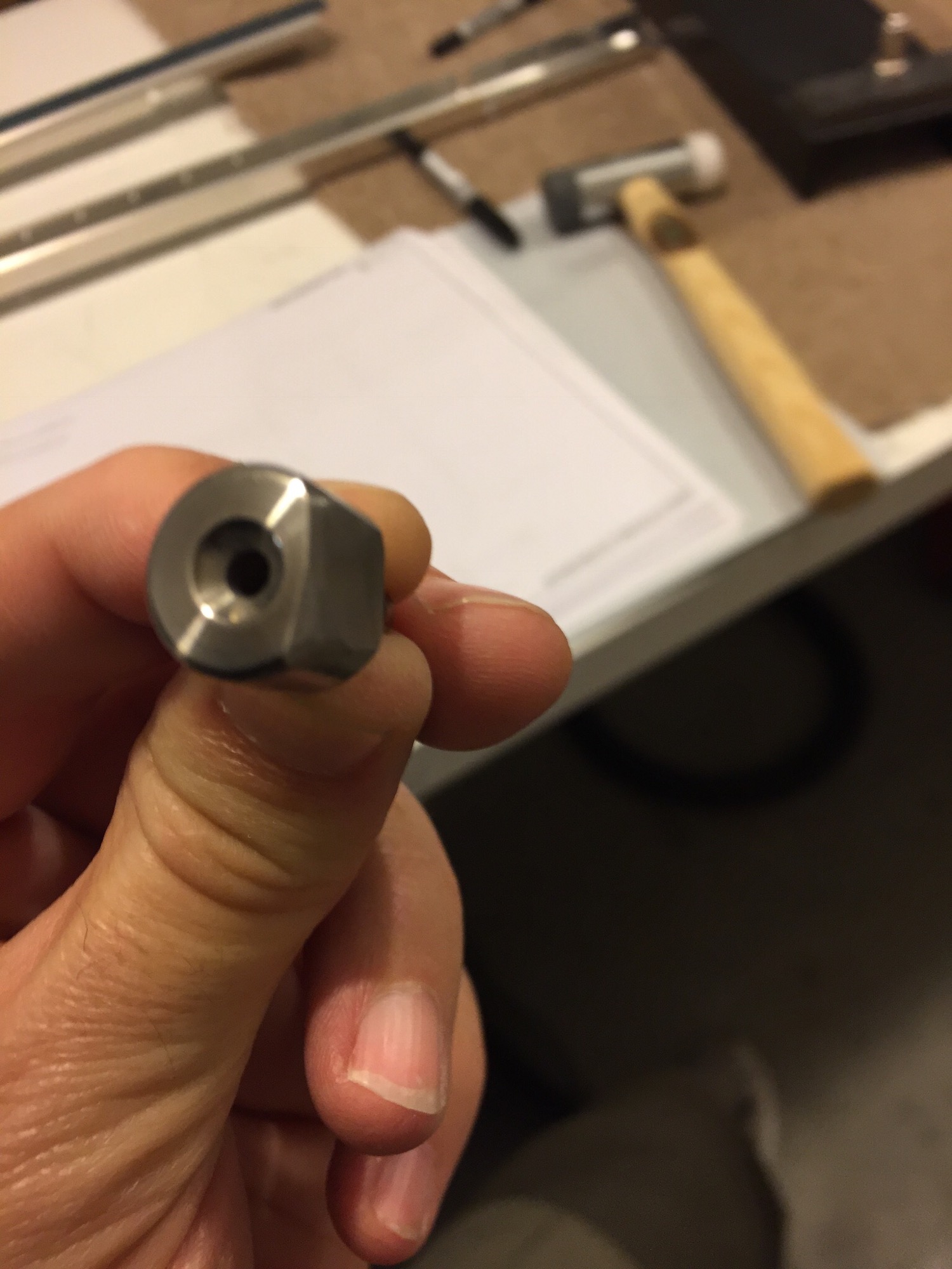 The next job is to dimple the #40 and #30 holes in the flanges of the bulkheads. The bulkheads will be riveted together, face to face which means that one bulkhead has a flange at an obtuse angle and the other an acute angle to match the line of the skin. This isn’t a problem for the flanges with an open angle as the squeezer yoke will fit with a normal female dimple die. However, the bulkhead with the closed angle flanges creates a problem in that the dimple set won’t fit inside and would deform the flange if you tried to squeeze it. Solution? I had a spare female die which I ground the edge off on one side so that it would fit the closed angle – job done. This maybe why Cleaveland sent me two in the original tools package.